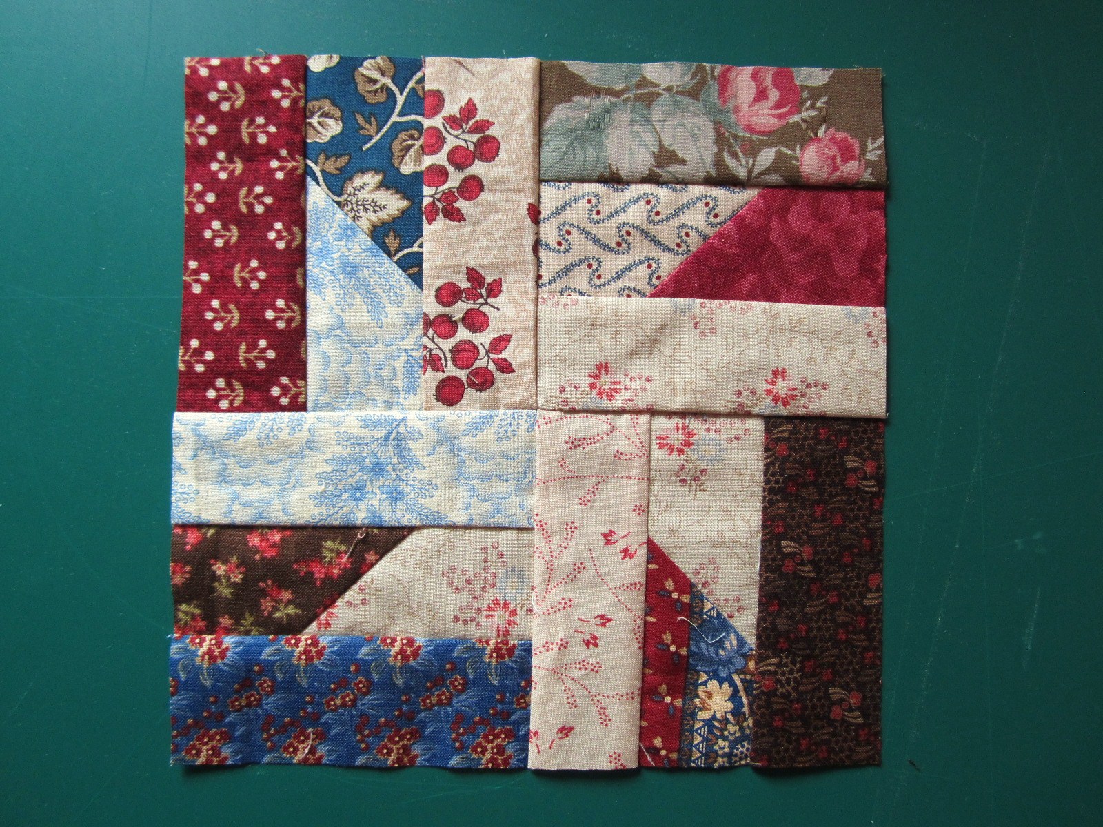 Le reste est tout simple : on coud chaque élément pour faire quatre pavés à assembler ensuite entre eux comme sur la photo du bloc ci-dessous. Il faut privilégier l’alignement des pièces côté centre, afin de pouvoir ensuite bien équerrer l’extérieur de bloc sans trop perdre en taille. Privilégiez aussi la couture organisée à la chaine, cela va vite et on se trompe moins !