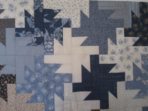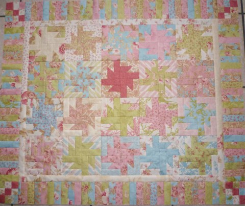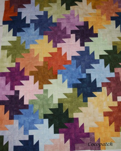 – et dans la blogosphère française, j’ai vu récemment ce modèle traité encore différemment chez Cocopatch : il s’agissait là d’un ouvrage proposé par Magic Patch (Pop Corn d’Elly Prins). Elle m’a très gentiment offert cette photo de son ouvrage qu’elle va transformer en Quillow (quilt plié dans une poche cousue au dos et qui devient une sorte de taie d’oreiller : voir cette vidéo que j’adore !). Voici son top en tessellation (= les blocs s’imbriquent) :