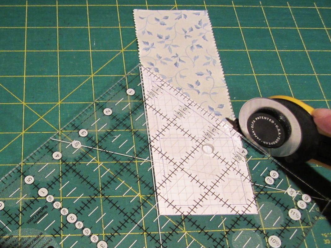 Ici, j’ai marqué exceptionnellement le trait de couture pour montrer qu’on part du creux entre les 2 tissus et on arrivera au creux du bas. Ces bandes sont coupées en zig-zag car ce sont des bandes prédécoupées de « Jelly Roll » (kit de tissus préparé par Moda).