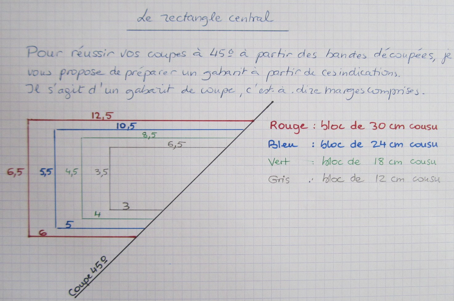 - B – 2 rectangles de : 3,5 x 9,5 cm (bloc de 12), 4,5 x 12,5 cm (18), 5,5 x 15,5 cm (24), 6,5 x 18,5 cm (30) pour faire les rectangles bicolores. Cela vous fera les 4 pièces de la forme du gabarit. Pour faire la bonne découpe au milieu à 45°, je vous conseille d’utiliser le gabarit correspondant à la taille du bloc que vous avez choisi (voir ci-dessus).