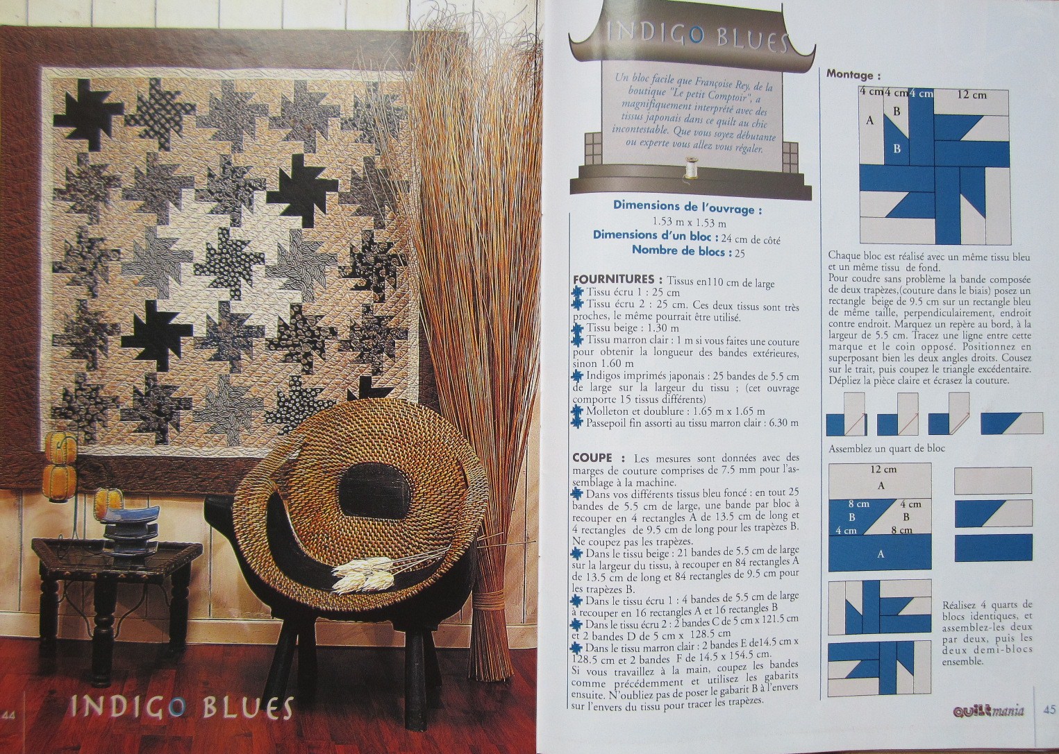 – un modèle de Françoise Rey, du Petit Comptoir à Toulouse, dont le modèle fut édité par Quiltmania (n° 37). Avec ses tissus japonais il a eu un succès considérable. Lorsque je me réfèrerai à ce modèle en particulier, je mettrai QM (= QuiltMania)