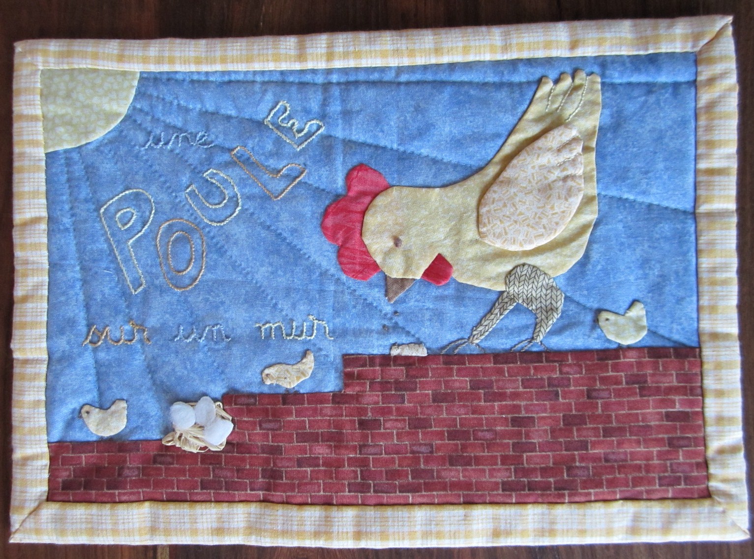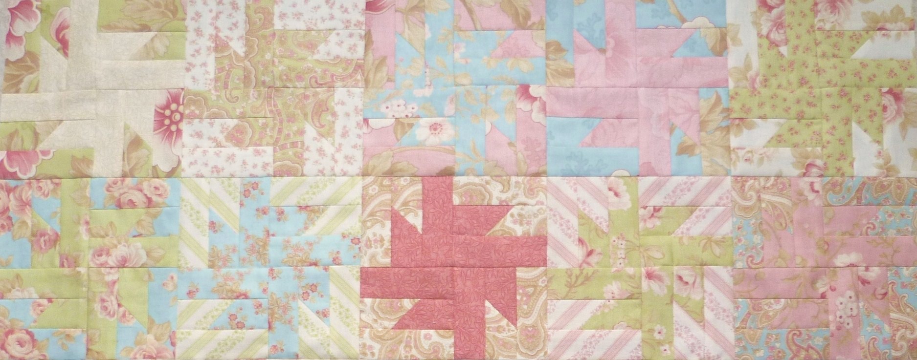 – deux modèles du livre A Touch of Rosie (Ed. Leisure Arts, 2010), l’un en couleurs vives, aux blocs montés sur la pointe et l’autre en pastel monté droit. Pour ce modèle, je mettrai Rosie !