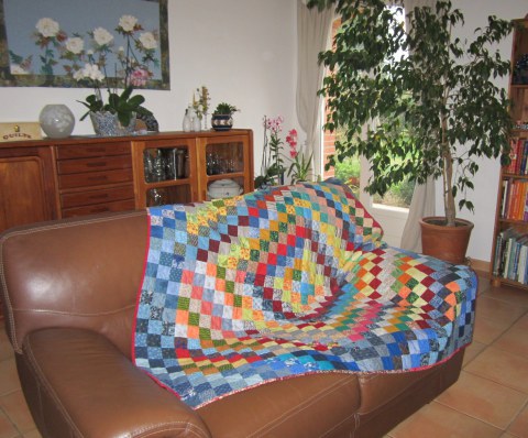 Enthousiasmant tout ça, n’est-ce pas ? Leur montage était expliqué différemment mais le résultat est le même. C’est justement une variante en tessellation ce que j’ai moi-même commencé spontanément avec mon Jelly Roll. L’accumulation de ces exemples vous donne déjà des idées des variantes possibles…