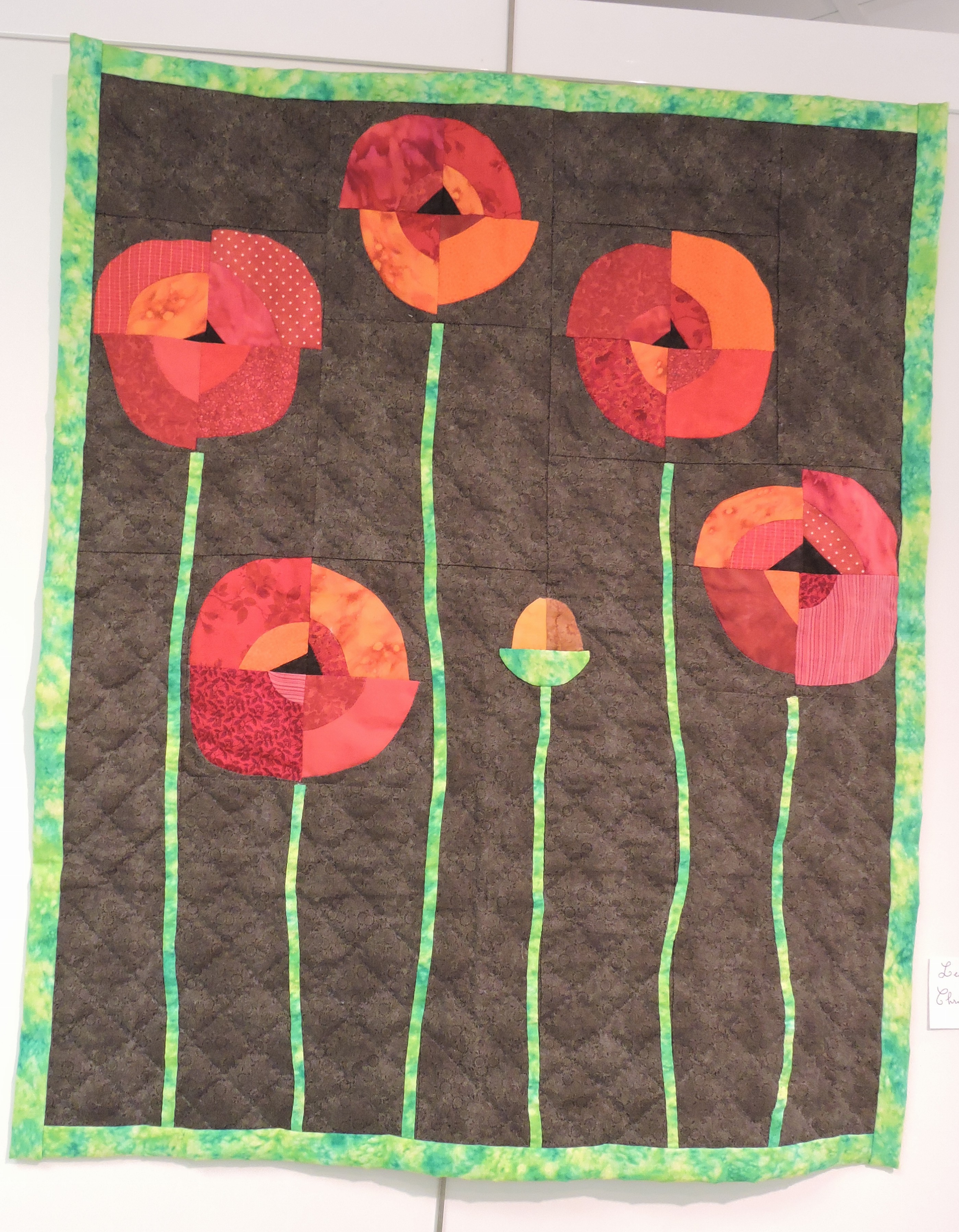 Des coquelicots faits par Christiane Goffeney, une version sur fond anthracite très simple et graphique, avec un beau quilting main en croisillons.Prairie d’Or de Chantal Bommier, avec une très belle étude de dégradés. Cette technique donne une mosaïque impressionnante de petits bouts de tissus, mais la pratique est plus ludique qu’on ne le pense !