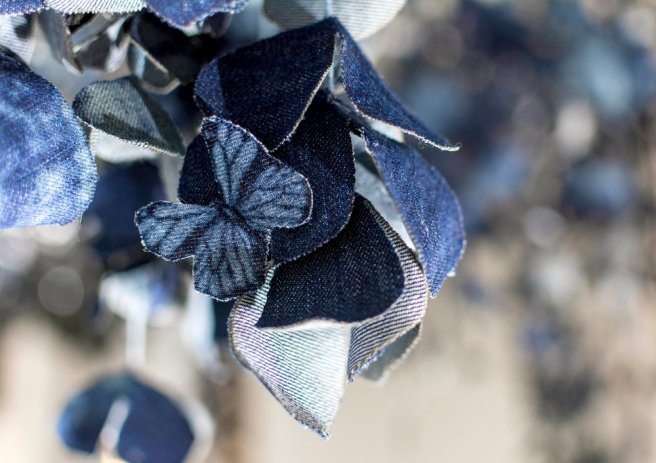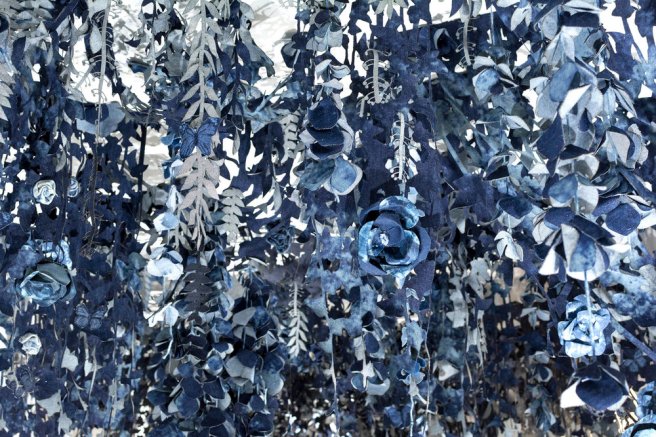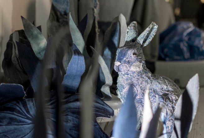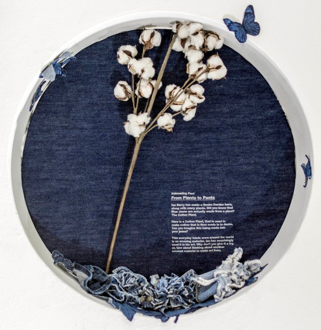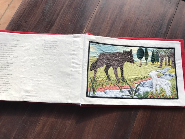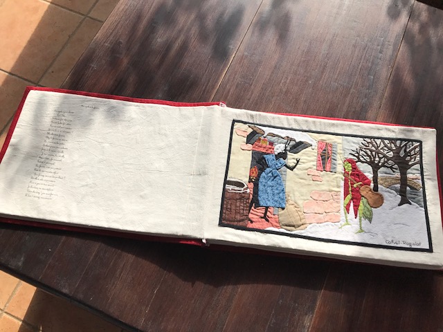 Les détails sont étonnants, le fond bleu étant mi-brodé de blanc, mi-appliqué de Velcro pour pouvoir ajuster les carrés colorés dessus ! Il faut l’écouter et le regarder nous révéler les formes d’hippocampes, de poissons qui se retrouvent dans les entrelacs blancs… Grâce au Velcro, le tableau vit et évolue !