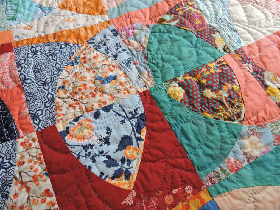 Comme pour le quilting traditionnel à la main, on peut utiliser un cercle ou bien un poids (comme de nombreuses quilteuses japonaises). En revanche, maintenant j’utilise un fil plus épais et ma préférence va vers le coton perlé n° 8 avec une aiguille à broder pointue n° 7. Le dessin peut suivre librement les coutures ou faire un tout autre motif, c’est votre choix ! Le geste est le même qu’avec de fines aiguilles between, mais les points sont plus longs. Ce quilting est apparenté aux traditions multiples qui utilisent le simple point avant, longuement évoqué ici. J’avoue avoir du mal à garder mes points aussi longs que j’aimerais, comme du sashiko. C’est pourtant plus adapté au style de ce matelassage. C’est peut-être mon 10e quilt quilté au coton perlé mais certainement pas le dernier !