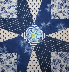 Le quilt a été rapide à assembler. J’ai achevé le quilt-top en un week-end. C’est très satisfaisant d’avoir des projets comme ça de temps en temps. J’ai choisi d’ajouter un bord bleu pour rehausser les couleurs plutôt sombres du quilt. Ce tissu bleu représente les couleurs des « Paua » (ormeaux) qui sont très courants en NZ (mon mari part souvent à la pêche et nous mangeons des beignets d’ormeaux régulièrement).