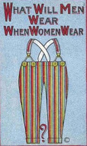 Les blue jeans sont un des vêtements les plus emblématiques du XXe siècle… et cela ne semble pas changer au cours du XXIe. On en porte maintenant dans le monde entier et il y a beaucoup à raconter, de la création de la toile de Nîmes (denim) à l’emblématique Levi’s 501, du froc de travail aux podiums de haute-couture féminine… La semaine dernière, j’ai beaucoup aimé l’article de Barbara Brackman sur les premières tentatives féminines pour porter le pantalon, bien plus commode. Cela donnait lieu a ce genre de réactions, si étroites d’esprit :