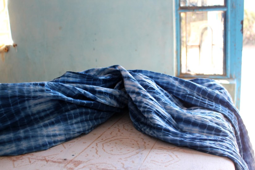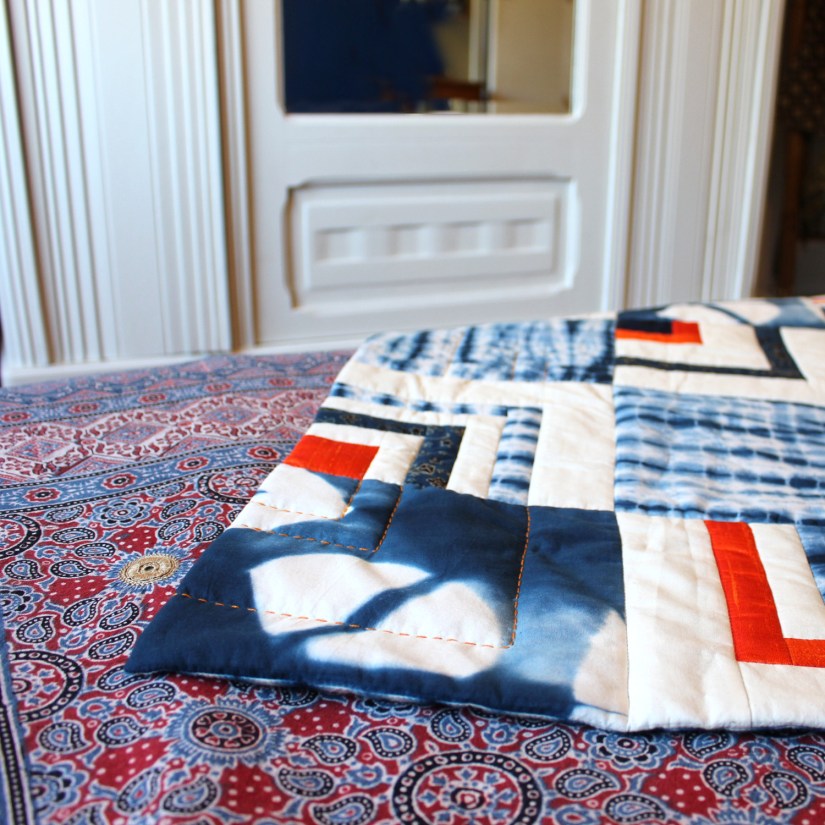 J’ai aimé faire du patchwork avec divers tissus teints en tie & dye par Mustafa et autres tissus de notre stock, teints eux aussi en indigo, mélangés avec de la toile blanche et des accents orange :