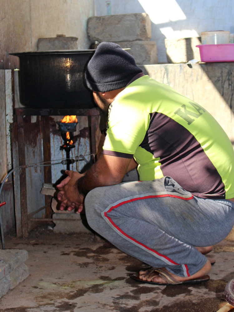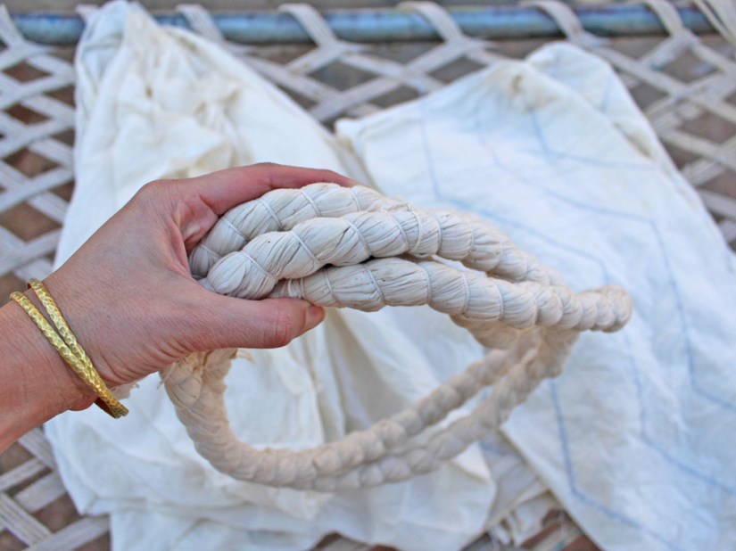 Mustafa ligature ensuite le tissu sur toute sa longueur.