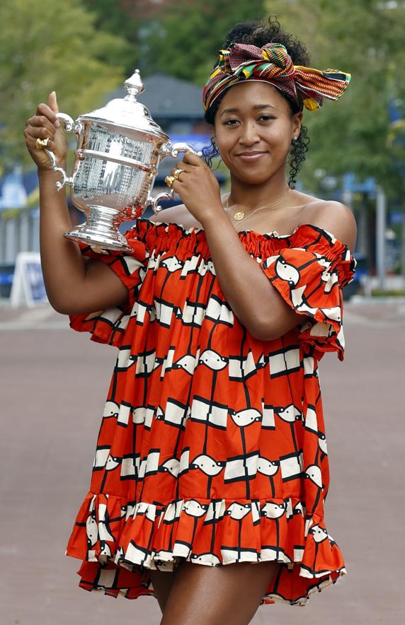 Naomi Osaka en 2020, avec sa coupe de l’US Open, vêtue et coiffée en hommage à ses racines haïtiennes.