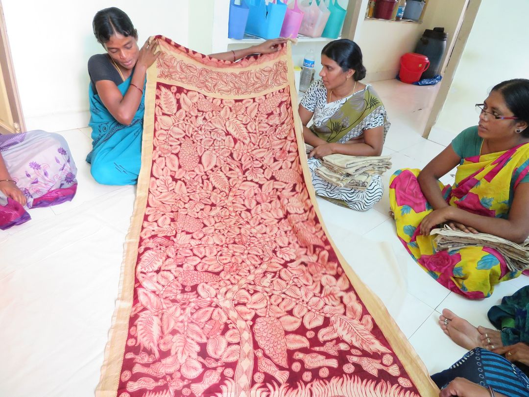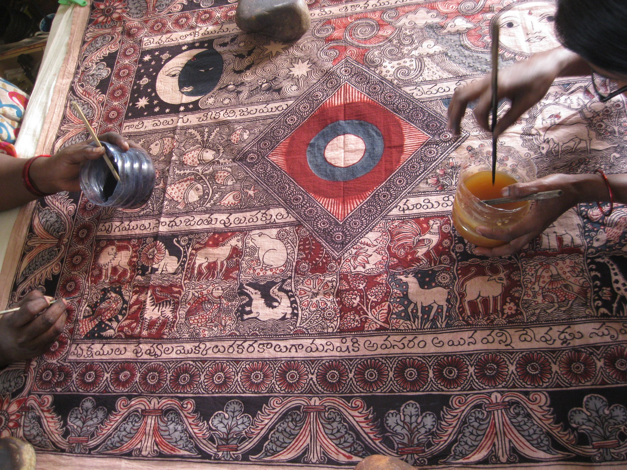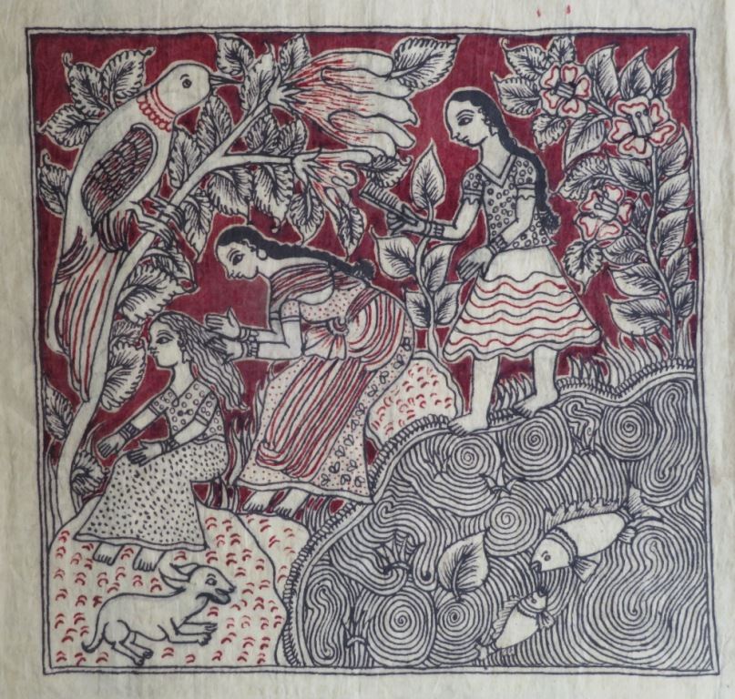 Exemple de toile dessinée et peinte : la séance de coiffure, par Kalyani. Comme pour les impressions de Neelam, toutes les couleurs sont obtenues avec des produits naturels, le coton est non blanchi, le mordançage (étape préalable à la peinture) puis la fixation sont faites « comme avant », selon les connaissances traditionnelles indiennes.