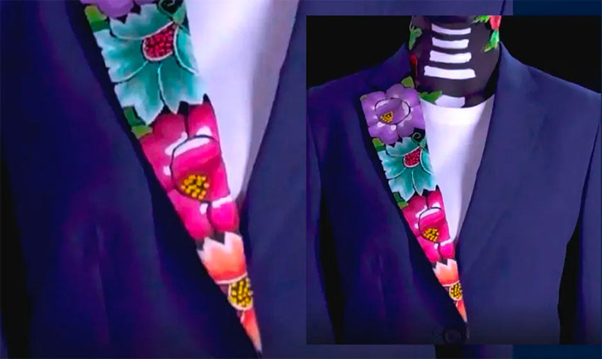 L’Hexagone est sobrement figuré par des brassées de fleurs de lys, symbole de la royauté, dans des bouquets d’inspiration impressionniste. Capture d’écran YouTube / compte Imagine One World KIMONO PROJECTLa Polynésie française a droit à son propre kimono avec ceinture aux motifs mélanésien. Capture d’écran YouTube / compte Imagine One World KIMONO PROJECT
