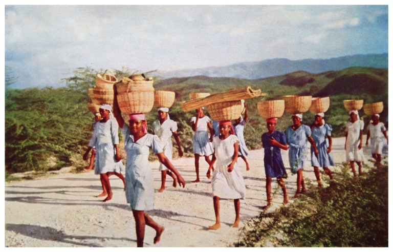 En Haïti, le tissu traditionnel n’est autre que le chambray. C’est un tissu en fibres végétales, de lin, puis de coton, d’aspect bleu ciel, avec un fil de chaîne indigo et un fil de trame blanc. A l’instar du tissu de jean (de Gênes) ou denim (de Nimes), on doit le chambray à la ville de… Cambray, où on ne fait pas que des bêtises ! Dans les caraïbes francophones, le mot est déformé en karabela. Les photos suivantes sont de rares témoignages de vêtements des années 1940-60 (Tumblr ARTDREAM)