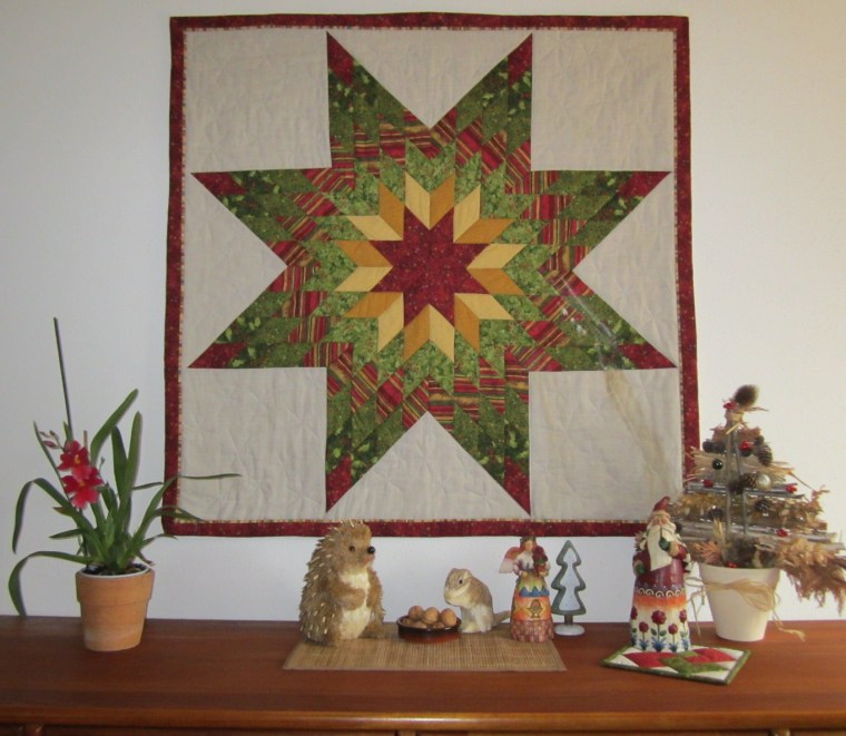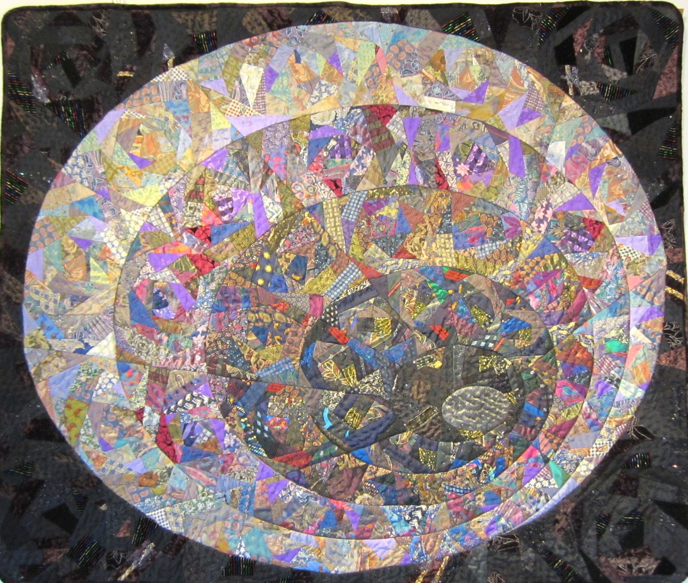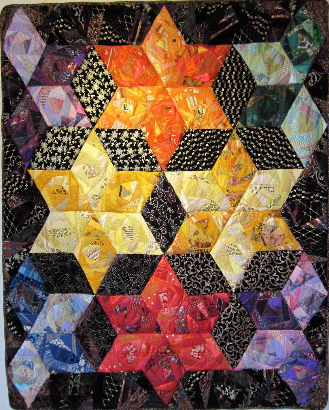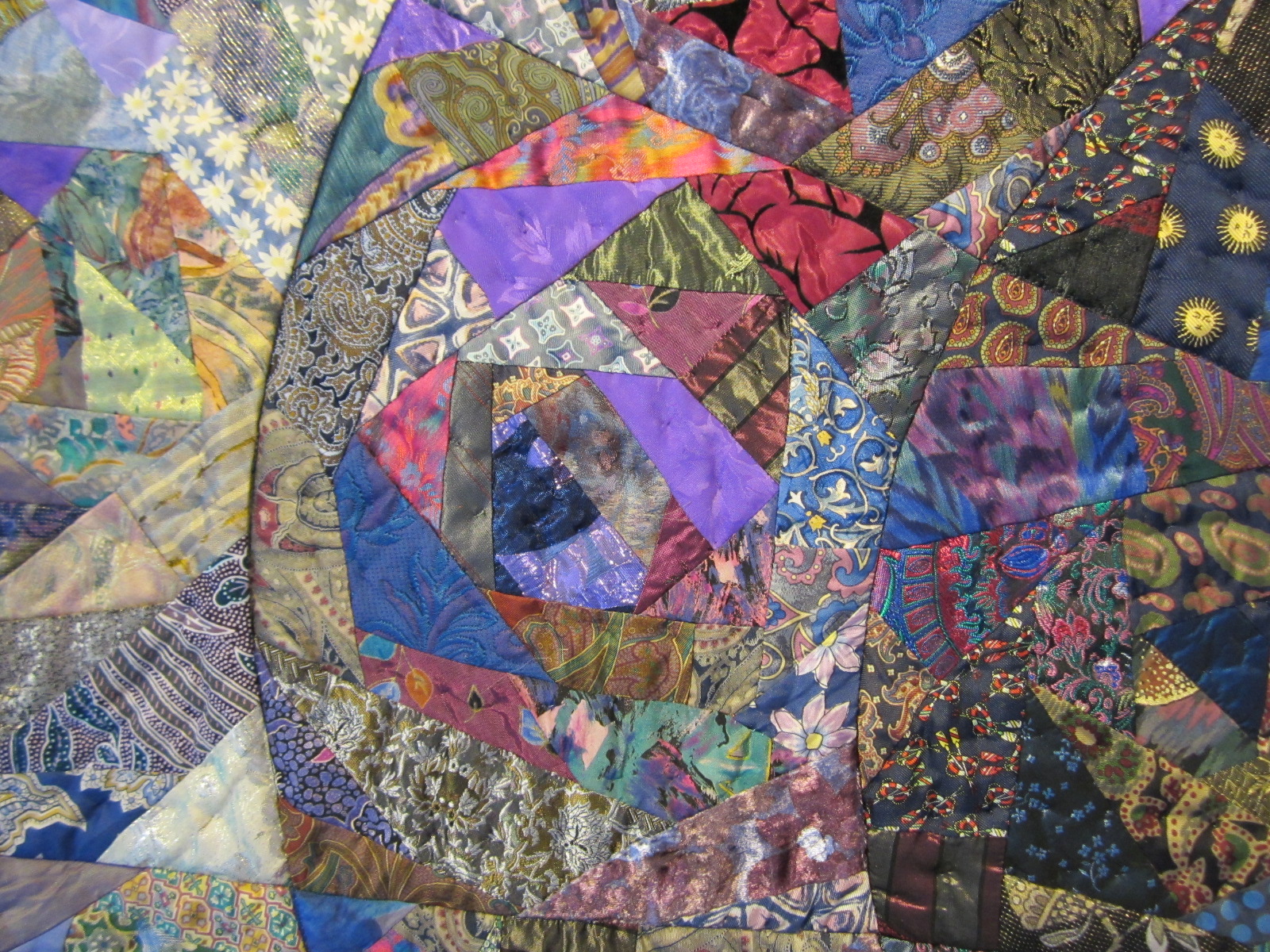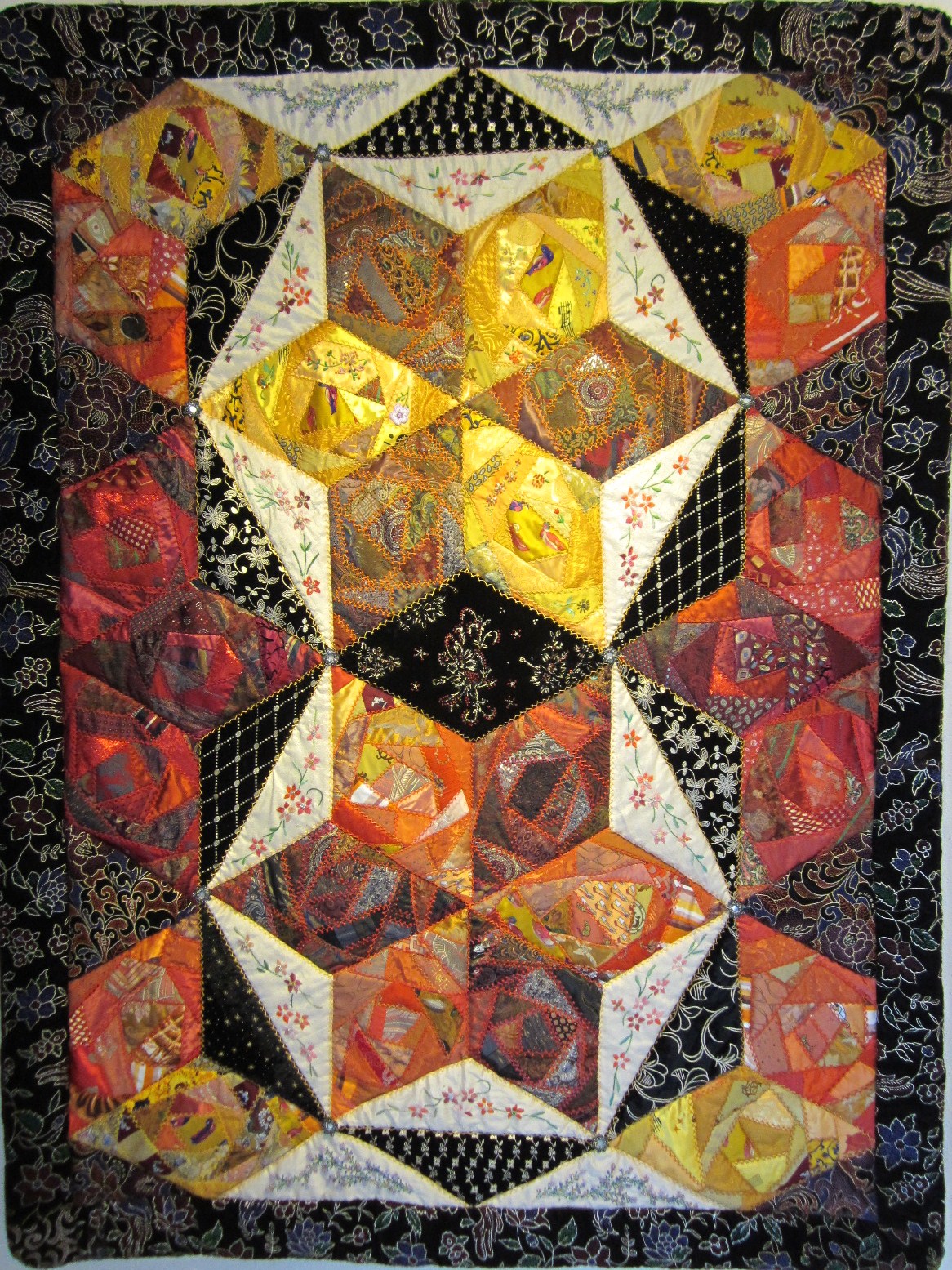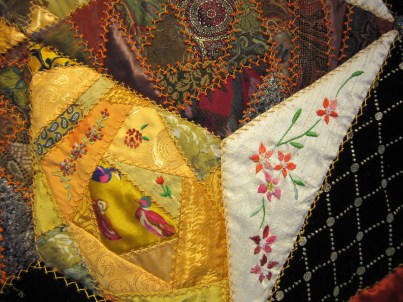 Si on accepte de lâcher la main, affirmer la personnalisation d’un modèle, c’est déjà un pas de fait. Beaucoup de quilteuses réussissent à interpréter un modèle en utilisant au moins une partie de leur Trésor, je veux dire leur réserve de tissus accumulés au fil des années… Et quand l’utilisation des restes de toutes sortes devient une jubilation, une fièvre de l’inattendu, le trésor devient le creuset de la création. C’est si drôle de mélanger tous ses souvenirs d’étoffes !