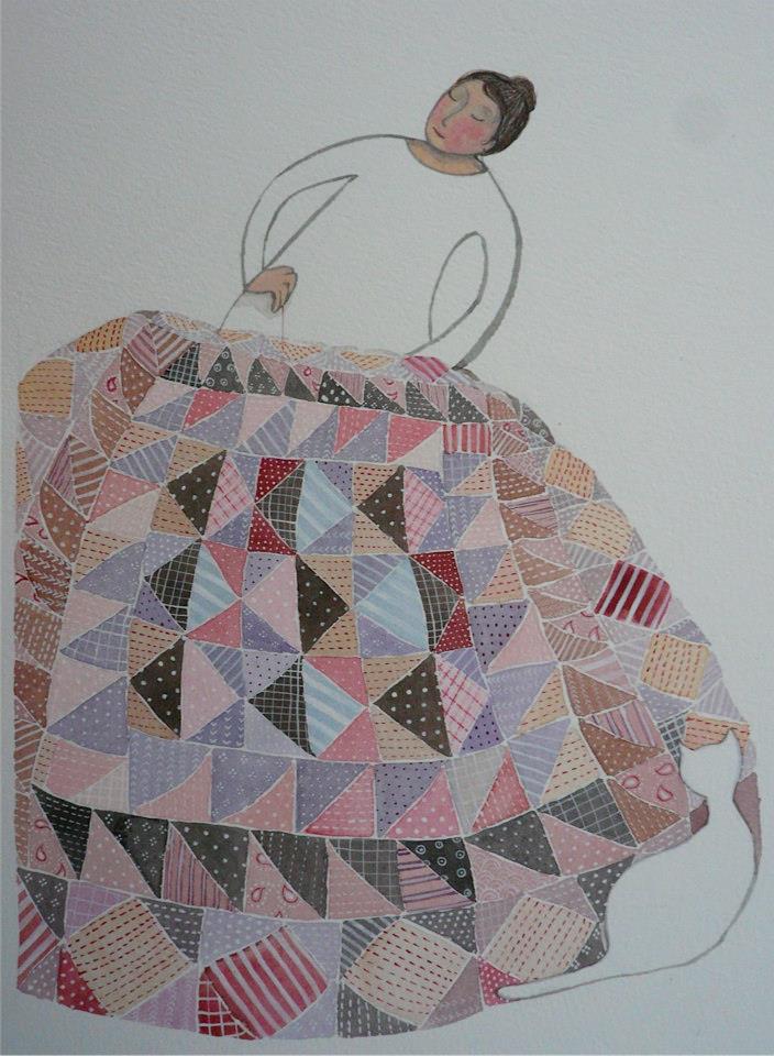 Nous sommes en Angleterre, au début du XIXe siècle. Les trois Dames Austen collectent les tissus afin de continuer leur ouvrage, en témoigne la lettre datée de 1811 de Jane à sa sœur : « As-tu pensé à récupérer des tissus pour le patchwork ? Nous sommes bloquées » (très librement traduit de “Have you remembered to collect pieces for the patchwork… we are at a standstill”). Leur ouvrage fait en commun est piécé dans la tradition anglaise, avec des morceaux de carton ou papier soigneusement découpés en gabarits, eux-mêmes enveloppés de tissus, puis assemblés au petit point de surjet. C’est ce qu’on appelle encore la méthode à l’Anglaise.