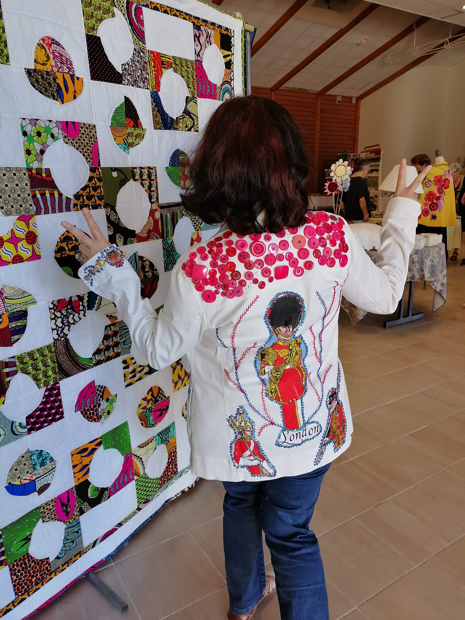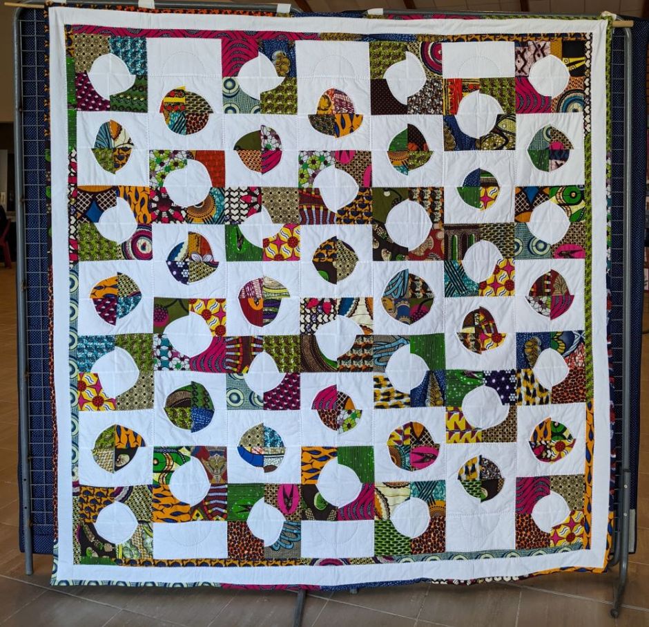 Nathalie Larchet est très fière de la créativité de sa maman, elle l’a encouragée à exposer ses quilts, dans l’esprit du patchwork qu’on aime : l’utilisation des chutes, le droit à l’erreur, la liberté de création, d’interprétation de blocs traditionnels dans la modernité.