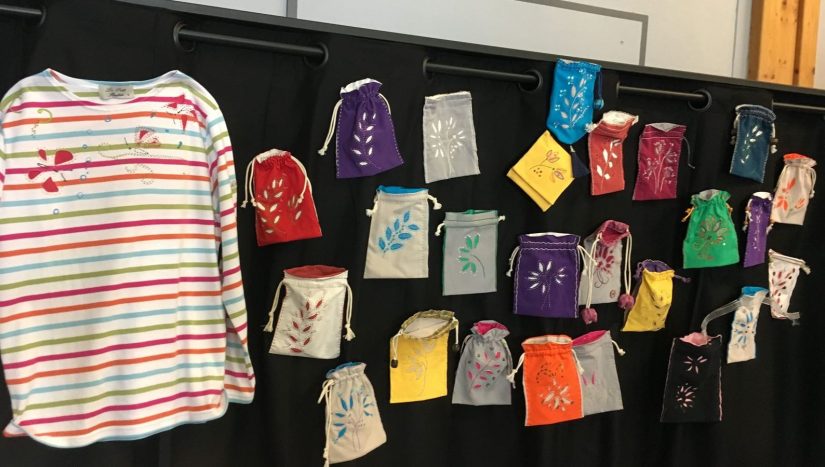 Nicole est déjà très familiarisée avec les arts textiles, les teintures artisanales et j’ai vu tant de belles choses dans son atelier ! Mais j’ai bien senti, au cours du stage, qu’elle était intéressée par les techniques de coupes à main levée. Voici le formidable résultat :