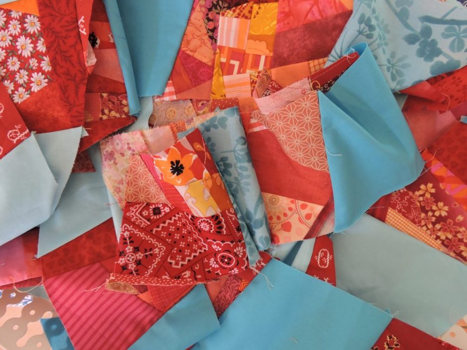 - Quand je fais un quilt scrappy, par définition j’utilise beaucoup de tissus différents que je brasse, remue… L’occasion de penser à l’ouvrage suivant ! Alors, quand j’ai pris un tissu Neelam pour les pliages de sous-verres, j’ai aussi coupé au moins un rectangle de 5 x 10 cm et/ou 2 carrés de 9 cm. Et j’ai continué avec les tissus voisins. Tous les plus petits restes dont on ne sait que faire, je les mets de côté pour une astuce de jeudi prochain !