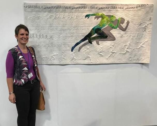 Il est des quilts qui marquent leur époque. Pour moi Le Sprinter en est un. Il est minimaliste dans le sens où le sujet est sur un « espace négatif » (= fond) large, on a une économie de couleurs, une silhouette stylisée et, détail génial, une ombre grise surlignant la forme… Mais l’extraordinaire se trouve dans la grande surface blanche richement quiltée à la machine, à découvrir !