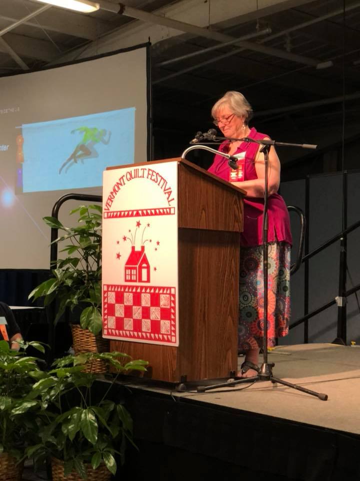 C’est le plus ancien grand festival de quilts (42 ans aujourd’hui), son adorable logo, très vintage, n’empêche pas d’avoir suivi l’évolution du monde des quilts ! Ici l’annonce du Meilleur Quilt innovant hors USA. Sur l’écran, on voit The Sprinter de Birgit Shüller (photo K. Einmo). C’était le 22 juin 2018.