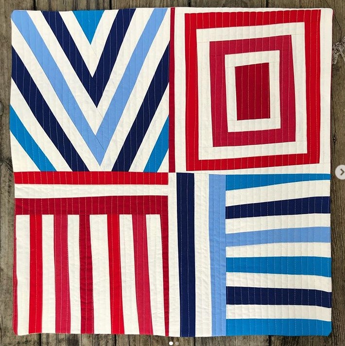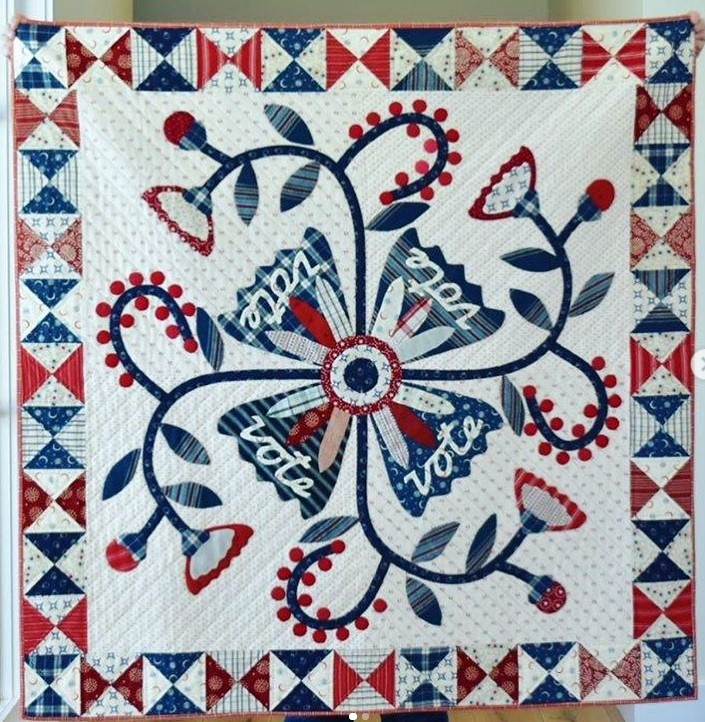 On sait déjà que, avant de connaître le gagnant des élections qui se font en ce moment aux USA, les Américains ont beaucoup plus voté que d’habitude. Et les quilteuses ont été prolixes à ce sujet ! C’est un véritable phénomène : des centaines de quilts ont déferlé sur Instagram avec quatre lettres : V O T E. Certaines quilteuses prennent parti en présentant leur quilt, d’autres restent neutres. La plupart des quilts sont avec les 3 couleurs du drapeau. On peut en déchiffrer certains car le rouge est la couleur des Républicains, le Bleu celle des Démocrates. Je n’ai pas vu d’âne ou d’éléphant cette fois-ci, mais des quilts d’inspiration très moderne. En voici quelques-uns, pour le plaisir !