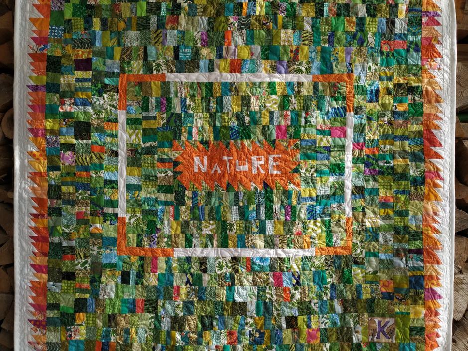 En faisant du patchwork, nous aussi nous réenchantons le monde. A partir d’humbles tissus, nous faisons de la magie ! Laissons-nous porter par la simple joie de créer, même si on n’aboutit pas forcément à un chef d’œuvre. C’est le cas avec ce nouveau quilt, où j’ai patiemment additionné mille souvenirs, mille restes d’autres ouvrages. Quand j’ai commencé par le mot NATURE en tissus blanc et orange, je ne savais pas du tout où j’allais ! Ce quilt témoigne des vertus du recyclage et de la liberté de l’improvisation.