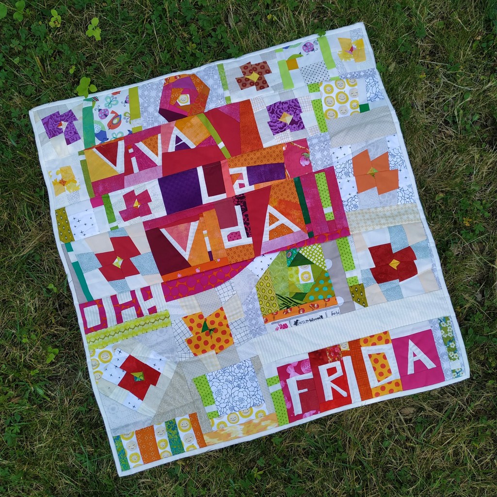 Claudine m’avait raconté son attachement à Frida Kahlo (elle aussi… notre muse à toutes ?) et j’ai été tout de suite intéressée quand elle m’a dit avoir fait un quilt en son hommage lors du premier confinement… Nous avons été nombreuses à avoir une fièvre du patch pendant ces 55 jours d’isolement, voici le résultat chez Claudine :