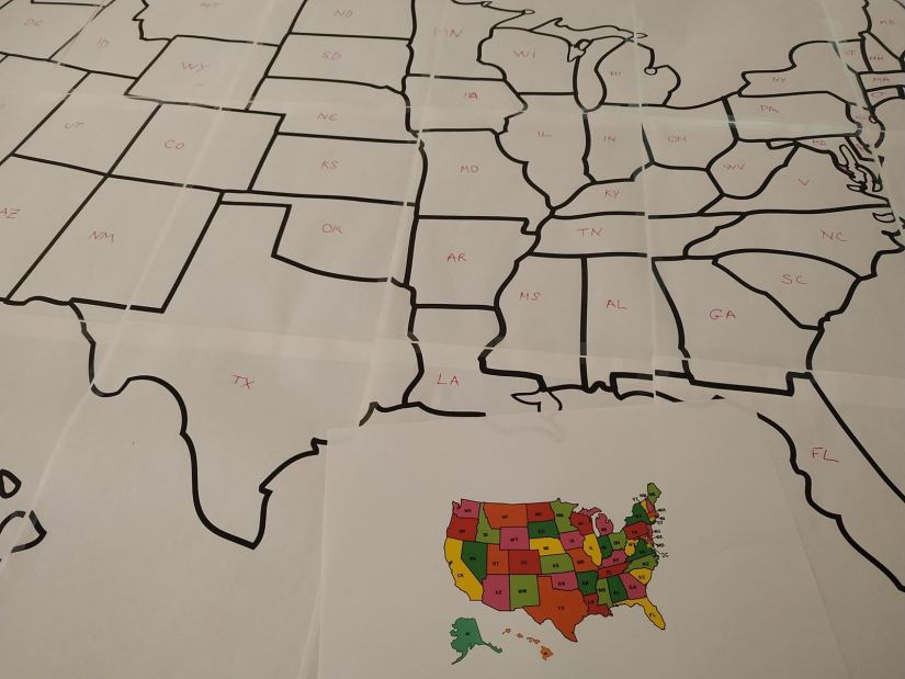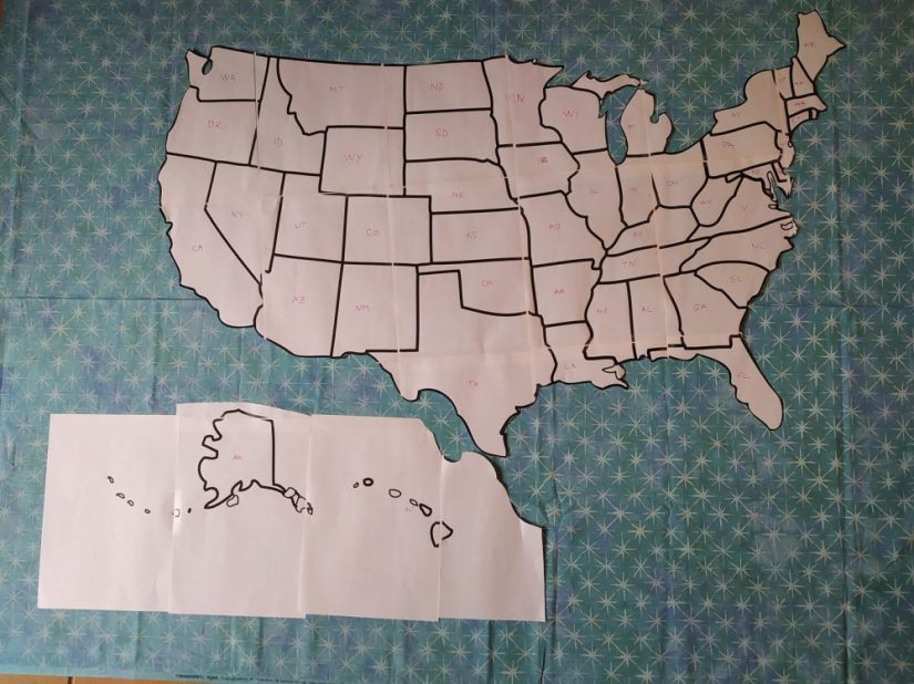 Pour ne pas me perdre au moment du découpage des pièces de ce puzzle, j’ai inscrit les deux lettres d’abréviation sur chaque état, à l’aide d’une carte. Forte révision de géographie !!