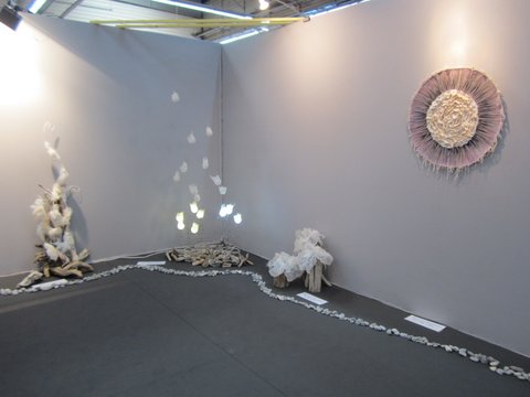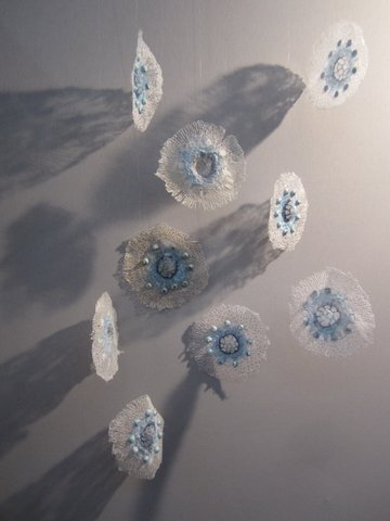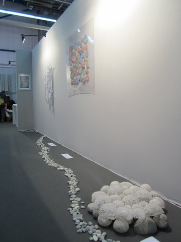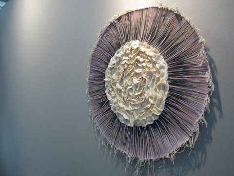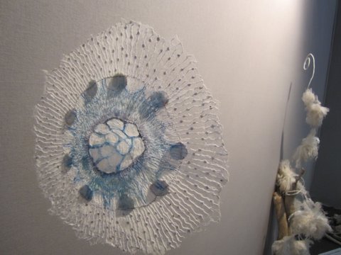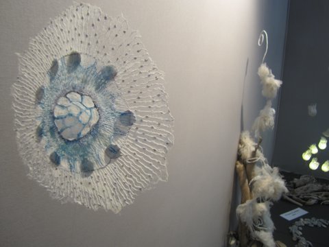 Fleurs, légumes, animaux, la Nature dans toute sa simple évidence est croquée par Misao Wada, mais aussi des souvenirs d’enfance ou de voyages. Le coup de baguette magique qui fait de ses appliqués des œuvres d’art est l’utilisation de tissus anciens, usés, décolorés, des tissus à trame lâche qui laissent passer le jour, et curieusement des fils contrastés et des points bien visibles qui, loin de nuire, donnent un halo de lumière et complètent l’aspect rustique déjà évoqué par les tissus. Je regrette de ne pas l’avoir abordée, une soudaine timidité m’a fait tourner en rond autour d’elle sans ouvrir la bouche !