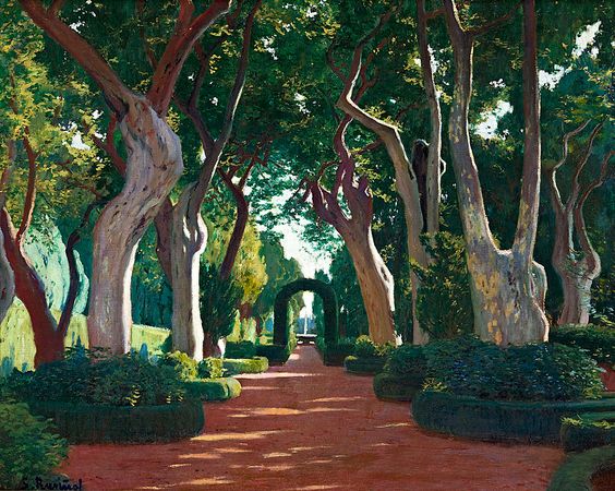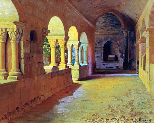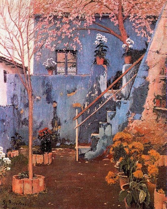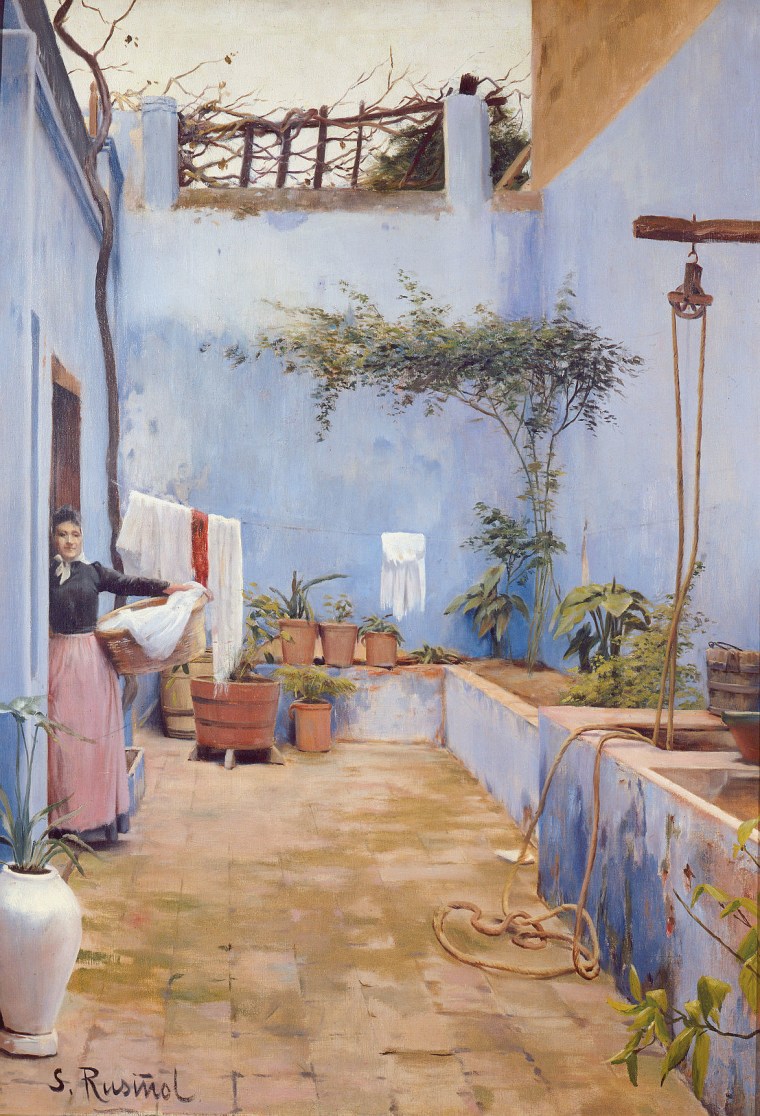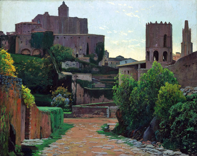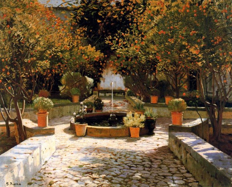 Jardins du Generalife, 1909Le cloître de Sant Benet de BagesJardin en terrasses à Majorque, 1911 Villa Aldobrandini (Italie)Vue de Gérone, ville à visiter absolument si vous allez en Catalogne ! Cela n’a presque pas changé…La rivière Onyar à Gérone (Gerona, Catalogne)Le Jardin de George Sand, 1905Ce Patio aux Orangers (1904) est au Musée de CastresCour bleue, Arenys de Munt (en Catalogne), 1913C’est le patio bleu de Sitges peint par Rusinol. 100 après il a subi des modifications, mais il est toujours bleu !