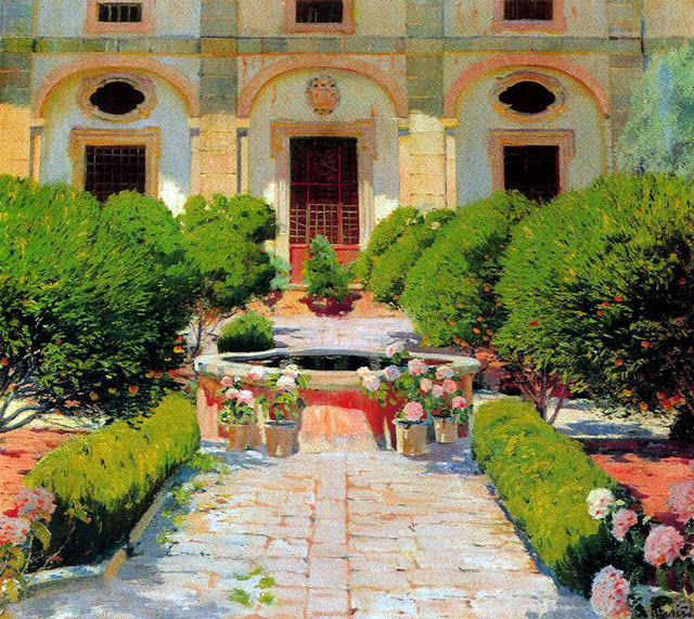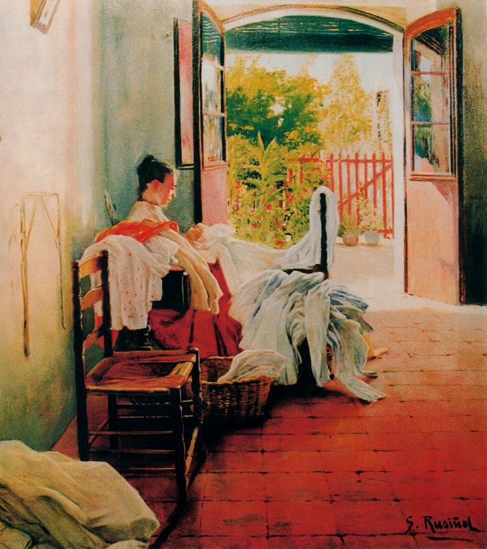 Les tableaux ci-dessus semblent désertés, paysages, jardins et maisons se suffisent à eux-mêmes… C’est le style Rusiñol ! Je vous rassure, il savait aussi peindre des personnes, la plupart du temps isolées pour mieux les appréhender, cependant son grand ami Ramon Casas est à ce titre meilleur peintre (ses portraits féminins sont splendides !).
