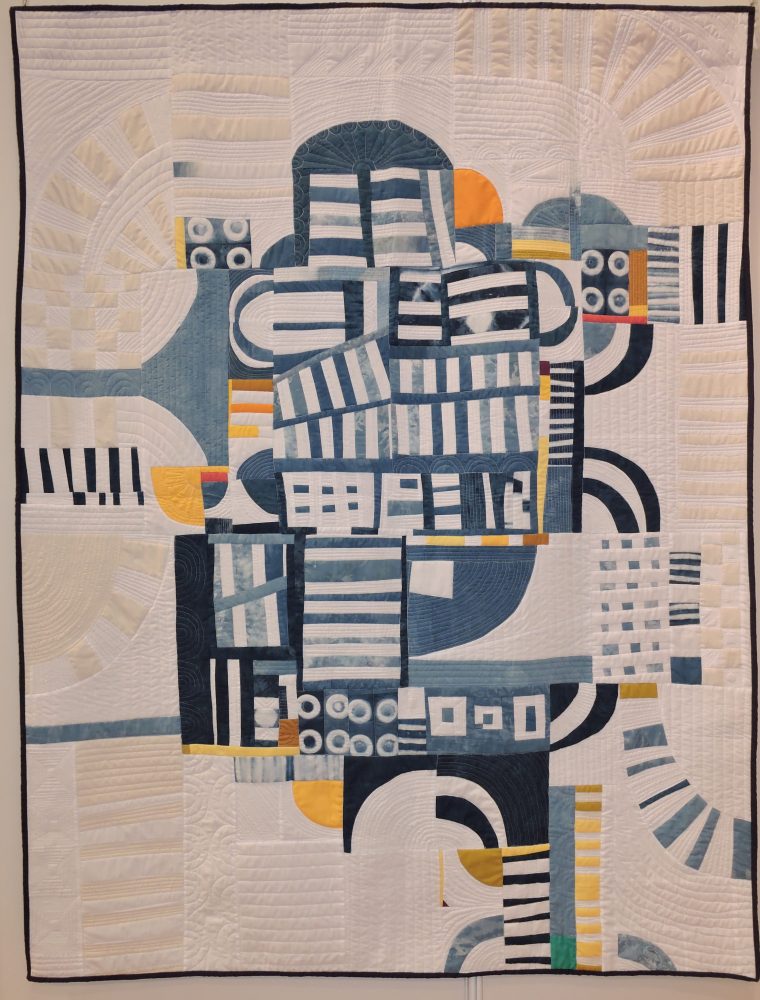 Canterbury #2, Debbie Grifka. C’est la spécialiste de l’utilisation des biais, elle explique ses techniques dans son livre Lines by Design Quilts, que je vous recommande.Sliced Circles, Karen LeeCette petite phrase est devenue un slogan féministe, un hashtag qui fleurit pour contrer les tentatives de réduire les femmes au silence ainsi que notamment les propos sexistes de l’actuel président des USA. Ici la quilteuse Liz Harvatine reprend 60 fois la phrase en matelassage, d’après l’écriture de 60 différentes femmes, sur fond de drapeau américain, pour soutenir Elizabeth Warren en particulier, éminente femme politique appelée Pocahontas par Trump. C’est une appellation jugée raciste, dans le contexte actuel.Aura, Nydia Kehnle