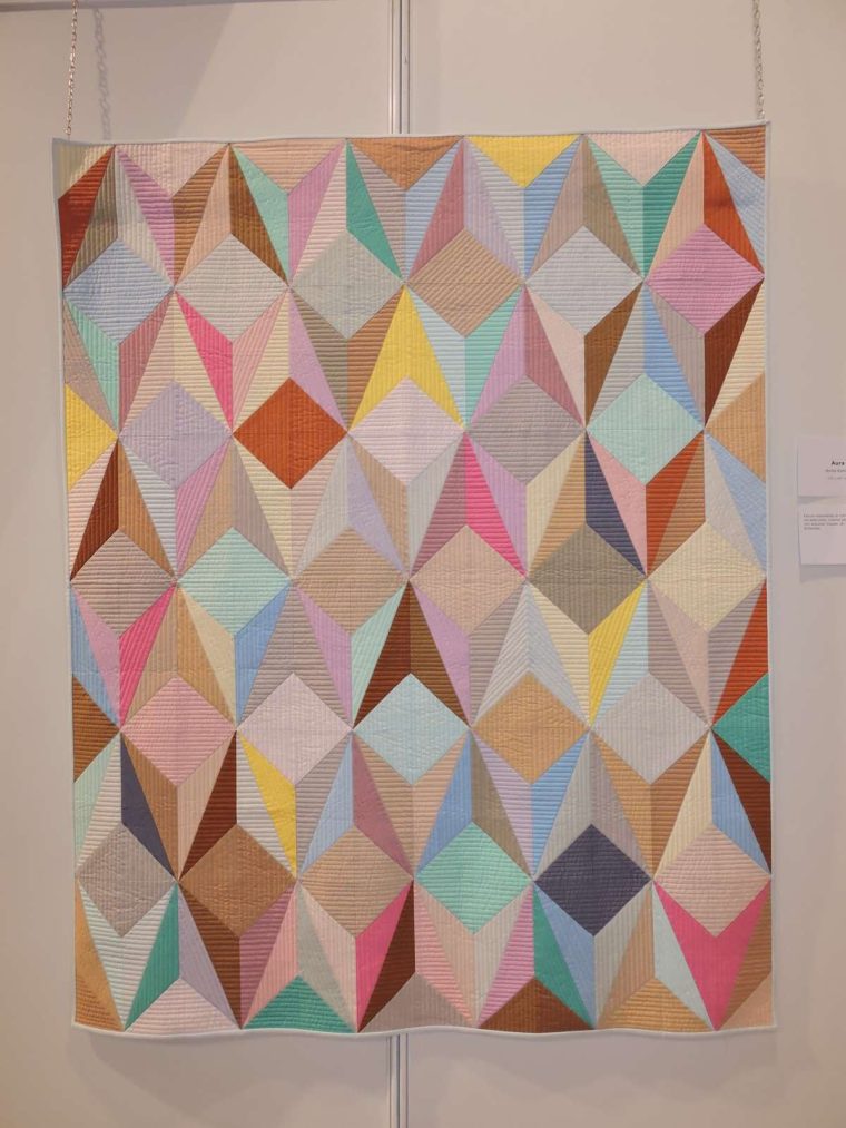Jeudi, c’était le jour où il y avait le moins de monde. Les quilts modernes attiraient pourtant déjà un large public . Au centre en arrivant, on pouvait voir un petit mais remarquable quilt, celui de Sophie Zaugg de Lunalovequilts !Voici Orange Pop de plus près. Il vous dit « quelque chose » ? C’est normal, Sophie avait offert ce modèle au magazine des Nouvelles (France Patchwork). C’est d’ailleurs bien indiqué sur le cartel de présentation 🙂