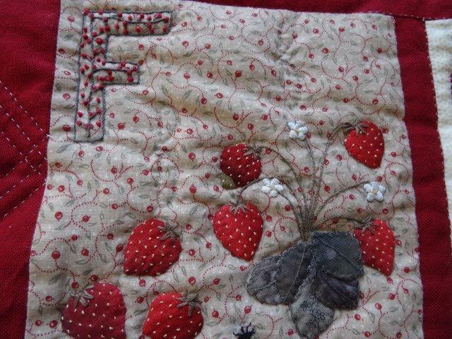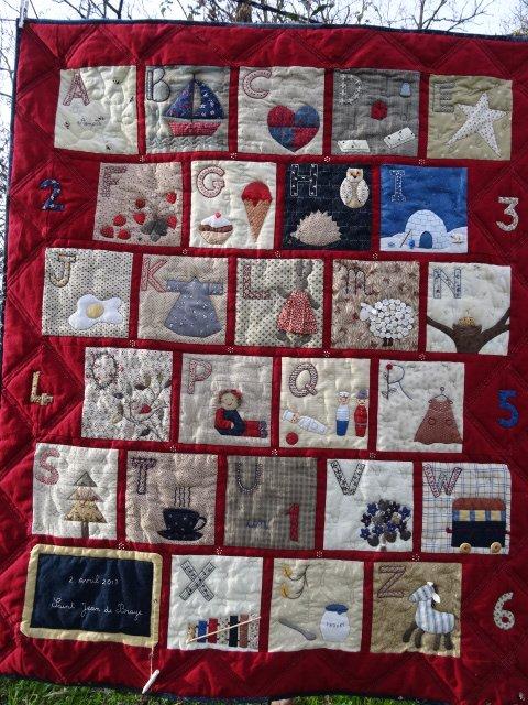 De A à Z, les lettres ont été brodées en s’inspirant de celles d’un livre de Yoko Saito édité par Quiltmania (traduit par Marie-Claude Tsuruya et son époux) :