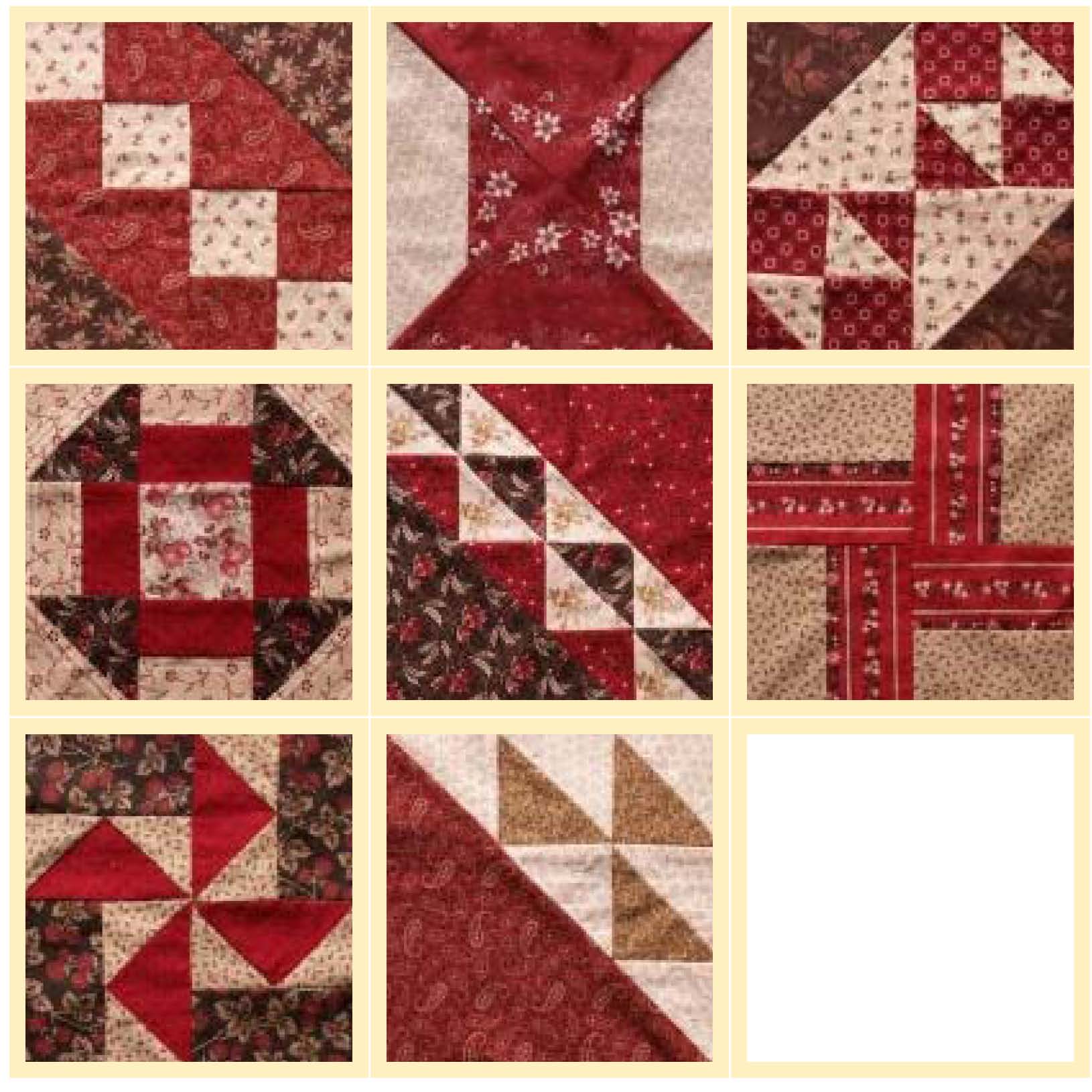 Ci-dessus la grille des blocs de Martine, avec une dominante rouge-brun-bleu. Vous avez son album, bloc par bloc, dans sa galerie Flickr. Elle n’utilise que des tissus de reproduction XIXe siècle. This is a sketch with Martine’s blocks, which are mainly red-brown-blue. You can see each block on her Flickr album. She only uses repro fabrics.