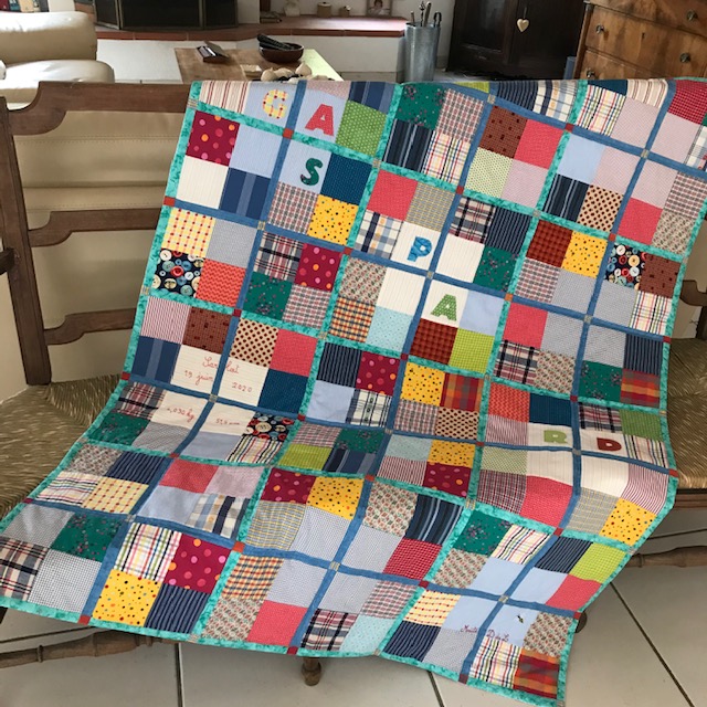 Dans ma précipitation, je n’ai pas respecté la disposition en écossais mais au final j’aime beaucoup mon quilt très coloré et gai. Le bébé est né, encore une joie familiale. Ma fille Florence m’a suggéré d’écrire GASPARD en décalé pour occuper les carrés clairs et j’ai brodé date, lieu de naissance, poids et taille sur le dernier carré blanc.