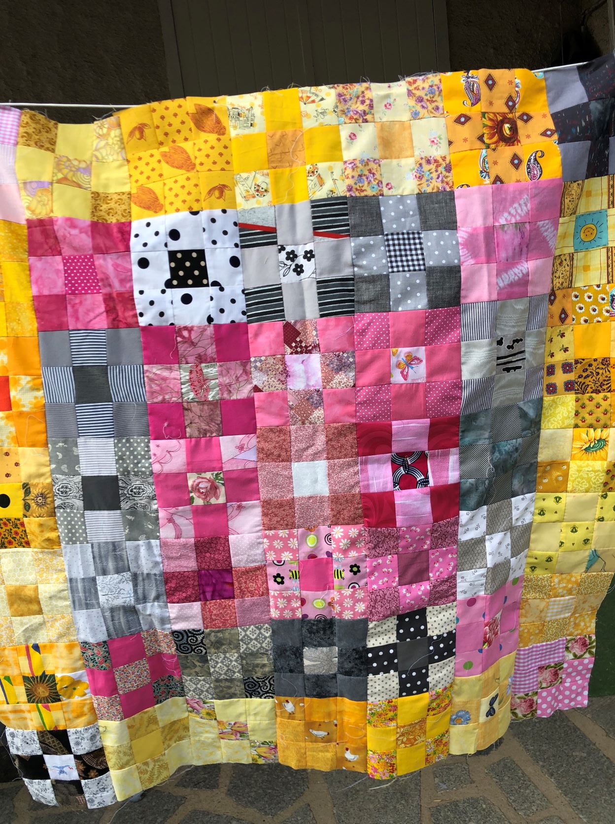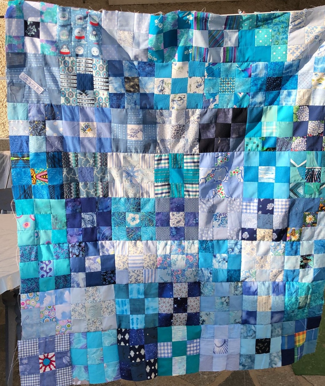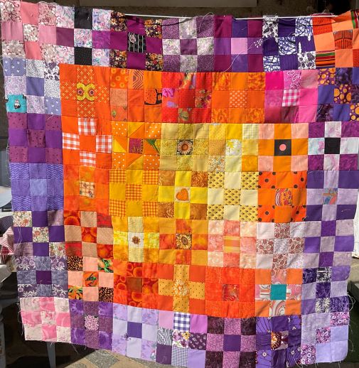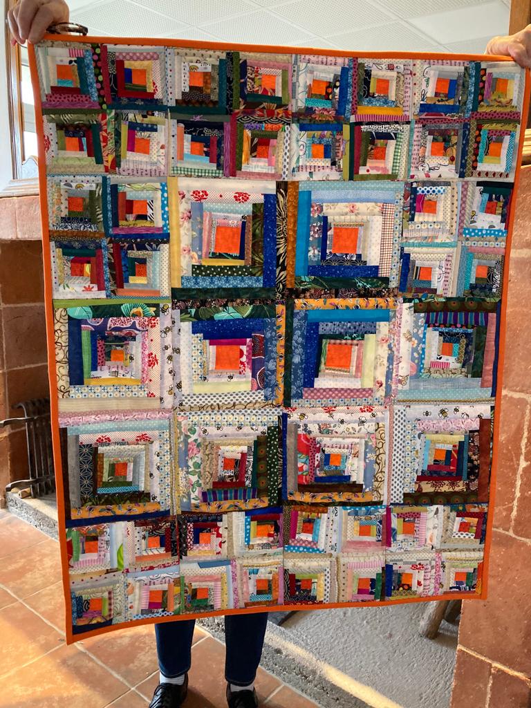 En ce qui concerne les graves inondations tout près de chez nous à la mi-juillet (Belgique et Allemagne), Cécile Milhau s’est mise à assembler des blocs faits par les quilteuses de la Courtepointe (Réalmont, Tarn) lors du premier confinement : des blocs 9-patch de 15 x 15 cm en scraps. Faits pour garder le moral et un lien, faits pour servir un jour… Quand tous les blocs seront assemblés et les quilts terminés, ils partiront en Belgique, où leurs amies correspondantes de Verviers se chargeront de la distribution sur place. Bravo les Courtepointières !