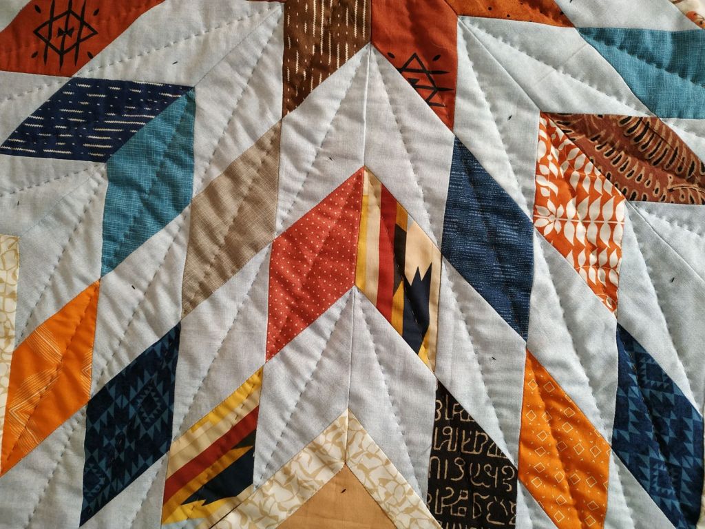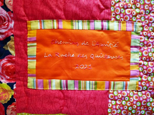 Au dos du quilt, j’avais mis les blocs un peu trop grands et divers coupons restants. Le top est d’après un modèle gratuit de Bonnie Hunter, Voyages scrappy autour du Monde, avec des chemins blancs qui sont les diagonales des blocs. Nous l’avons intitulé Chemins de l’Amitié. Je l’enverrai à Danielle début septembre, la délégation FP06 se chargera de faire parvenir ces dons à qui en a le plus besoin. Merci à elles.