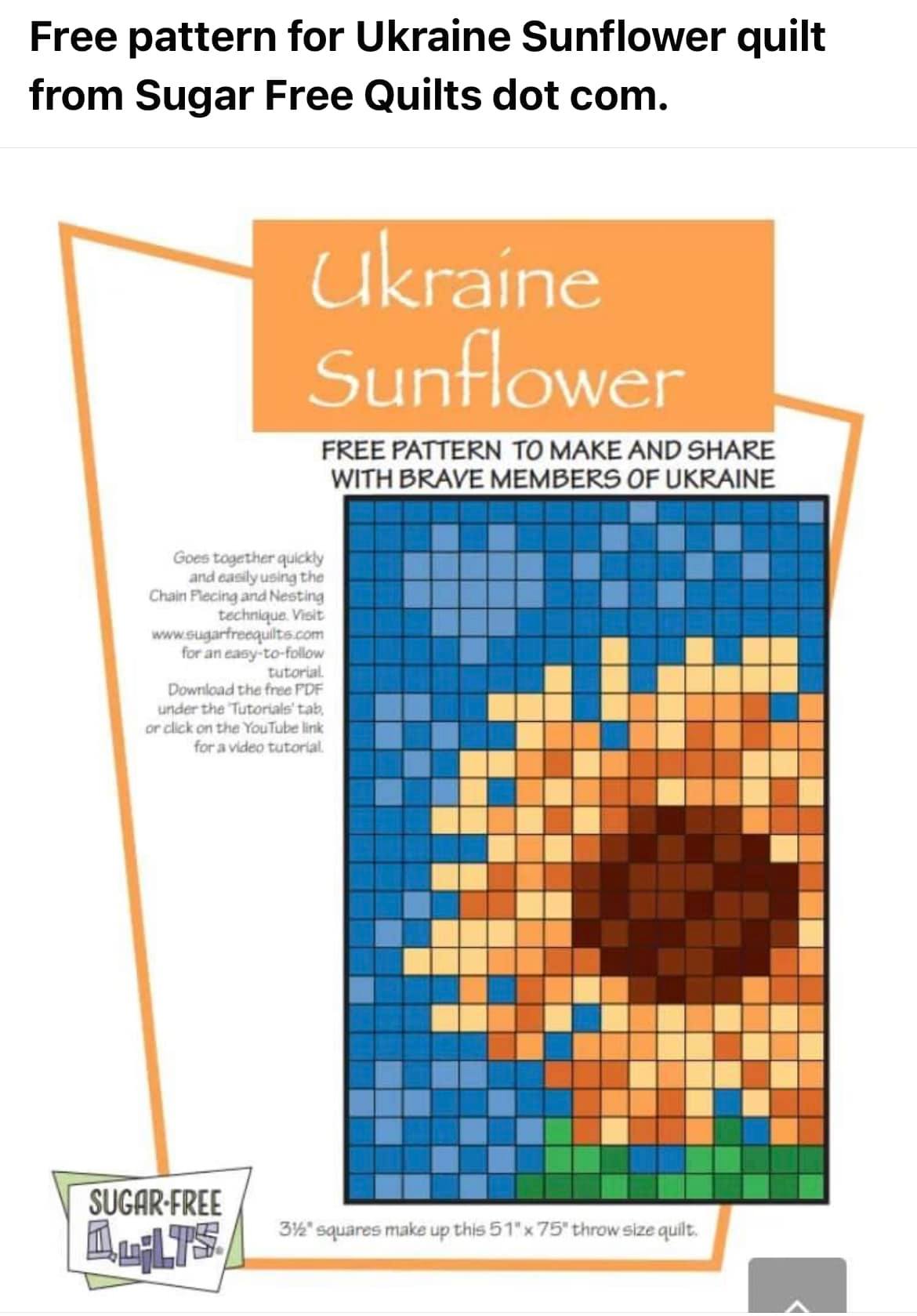 Vous avez peut-être vu un tournesol en couture sur papier, autre initiative. Il s’agit de la célèbre quilteuse australienne Kristy Lea @quietplay, qui a proposé un modèle de tournesol en PDF pour 4.50 dollars australiens, en vue de les reverser à l’UNICEF-Appel d’urgence pour l’Ukraine. Ses vœux les plus optimistes ont largement été dépassés puisqu’elle a reversé 11 200 dollars australiens (+ de 7 000 €) à l’UNICEF dimanche ! Tant d’argent sur son compte en deux jours était inattendu, merveilleux mais aussi c’était une responsabilité stressante. L’action est donc terminée et le modèle reste à notre disposition – gratuitement désormais. Même chose : voici le lien vers le site de la créatrice.
