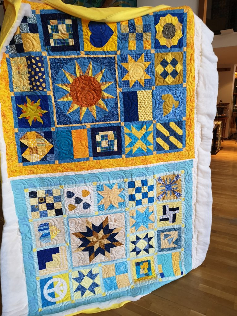 Un quilt pour les enfants ukrainiens : cliquez sur ce lien pour découvrir un très beau quilt offert à Claudia Pfeil, pour enrichir sa collection de quilts à offrir aux enfants ukrainiens.