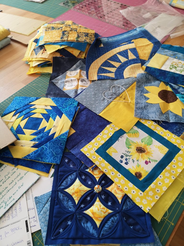 Claudia Pfeil croule, comme prévu, sous les blocs. Plus de 300 arrivés déjà jeudi dernier, et le rythme va s’accélérer. Maria Nelga, la présidente de la guilde de patchwork ukrainienne, a préparé un texte qui sera apposé sous forme d’étiquette sur chaque quilt offert par Claudia à des enfants ukrainiens, en voici une traduction :