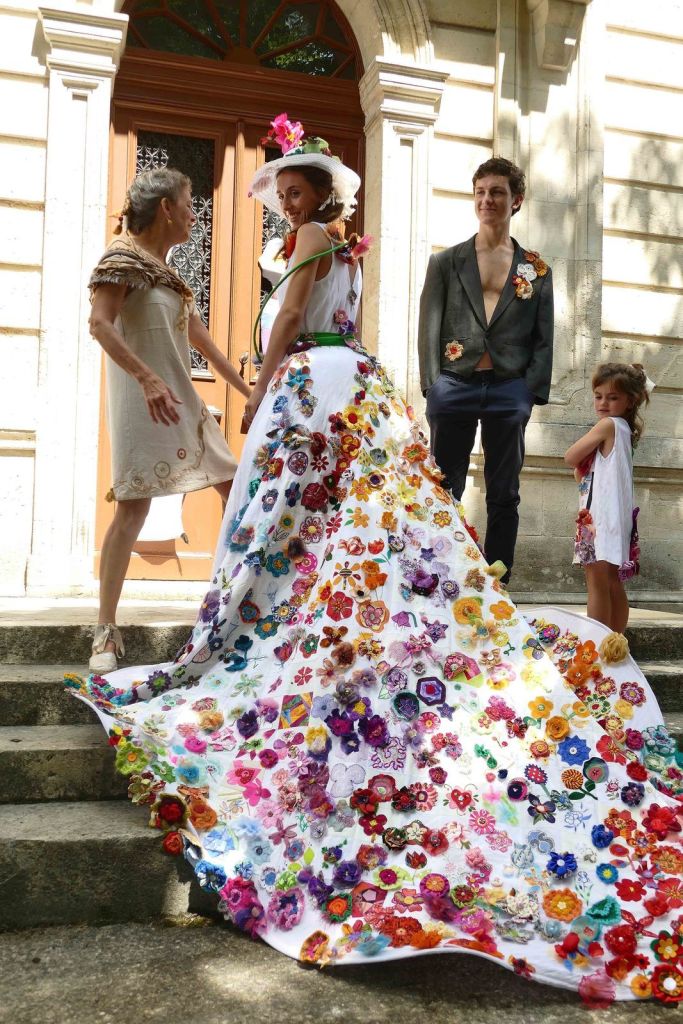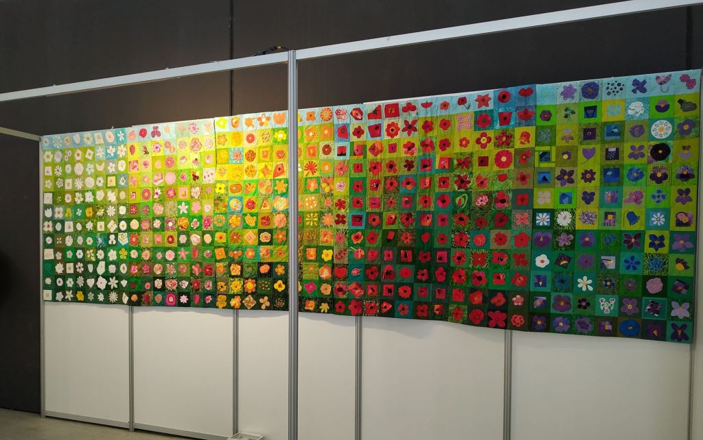 Comme bien d’autres quilteuses, mes amies et moi avions participé avec enthousiasme à la robe de mariée participative, à l’initiative de Joëlle Vétillard, avec des semis de Mille-Fleurs, ce style artistique tellement en vogue en ces temps médiévaux…