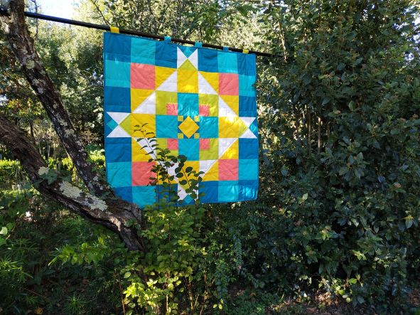 Mes quilts sont à présent souvent demandés pour des expositions, c’est en ce moment le cas à Tallahassee (capitale de la Floride) de fin août à fin octobre. J’y expose le Noir et le Bleu Caraïbes, ils sont bien appréciés. L’exposition s’appelle Out of the Blue et tu peux voir les 86 quilts exposés et expliqués par ici.