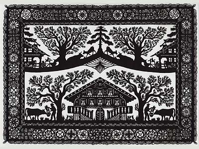 Ci-dessus vous pouvez voir deux petits ouvrages s’inspirant de la tradition des Scherenschnitte ou art de la silhouette : cet article vous en parle plus précisément. Tous deux mettent en scène des petits couples alsaciens : un couple sage avec des broderies aux rubans et un couple plus déluré qui reprend un dessin de Hansi.