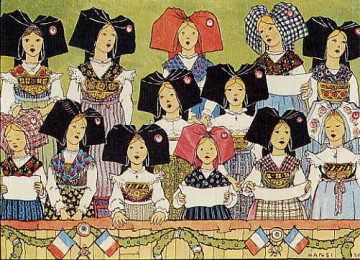Diversité des coiffes dans cette chorale peinte par Hansi : les noires sont généralement portées par les protestantes, les colorées par les catholiques.