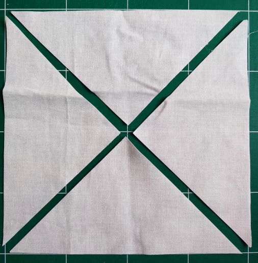 Voici la coupe en sablier. Si, par exemple, on veut un triangle à la base de 20 cm cousus, on ajoute 4 cm, on coupe donc un carré de 24 cm, puis on coupe les deux diagonales.On obtient 4 triangles identiques qui ont des marges de couture de 7 mm tout autour.