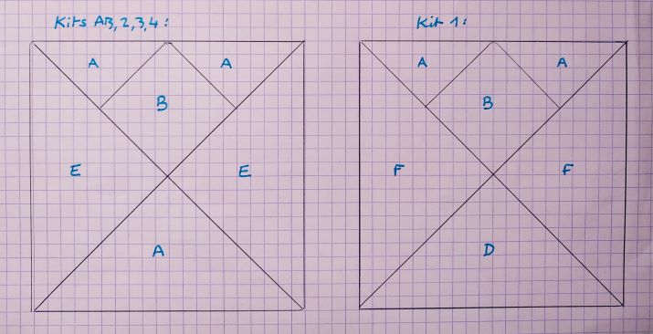 Tissu A : 2 carrés de 14 cm (coupés sur les 2 diagonales, en croix) et 1 carré de 24 cm (idem)