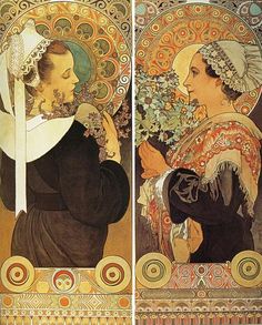 Ce duo de cartes postales, Les Bretonnes par Mucha, rappelle que l’art celtique est parfaitement adapté à l’art nouveau !