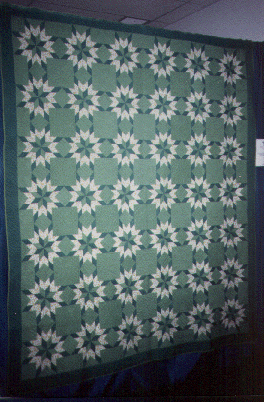 Margaret Rogers Caden de Lexington (Kentucky), a gagné le grand prix tant convoité avec son quilt intitulé « Star of Bluegrass » (environ 180 x 230 cm), ouvrage aux blocs piécés parfois appelés « Harvest Star », « étoile de la moisson ». La dominante verte (vert nil) très à la mode en tissus unis de la collection de Sears, a peut-être influencé le jury, mais aussi les très fins petits points de quilting et, plus sûrement encore, le trapunto qui rehaussait les feuilles ou plumes du matelassage. Mais par rapport à tant d’autres quilts présentés, celui-ci fait quand même bien pâle figure… Est-ce un choix par défaut, faute de consensus ?…
